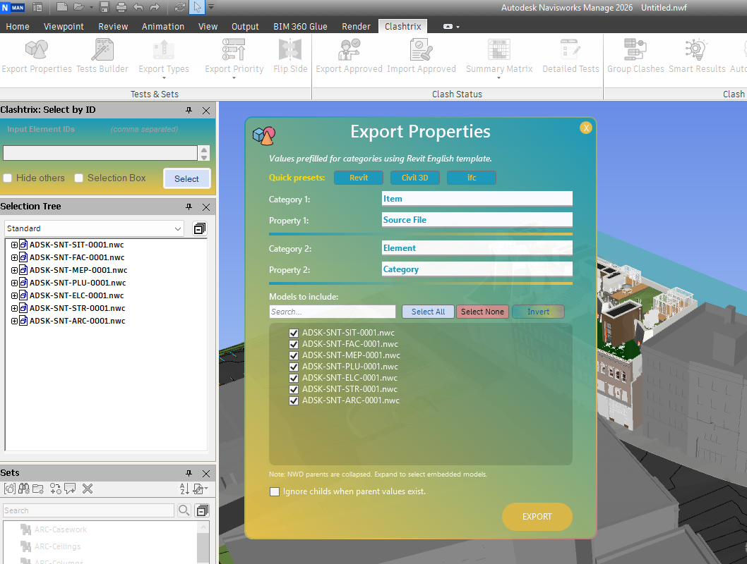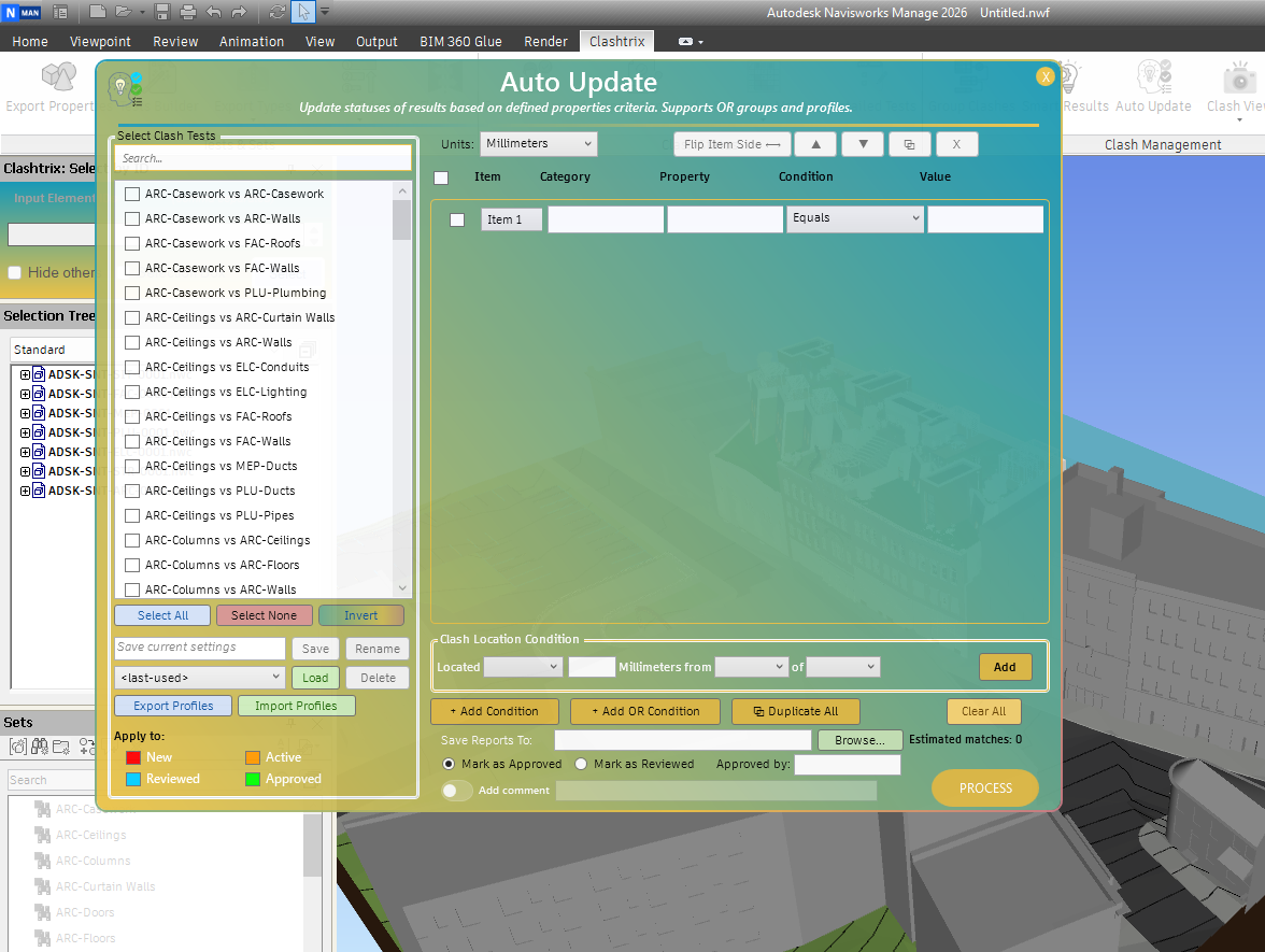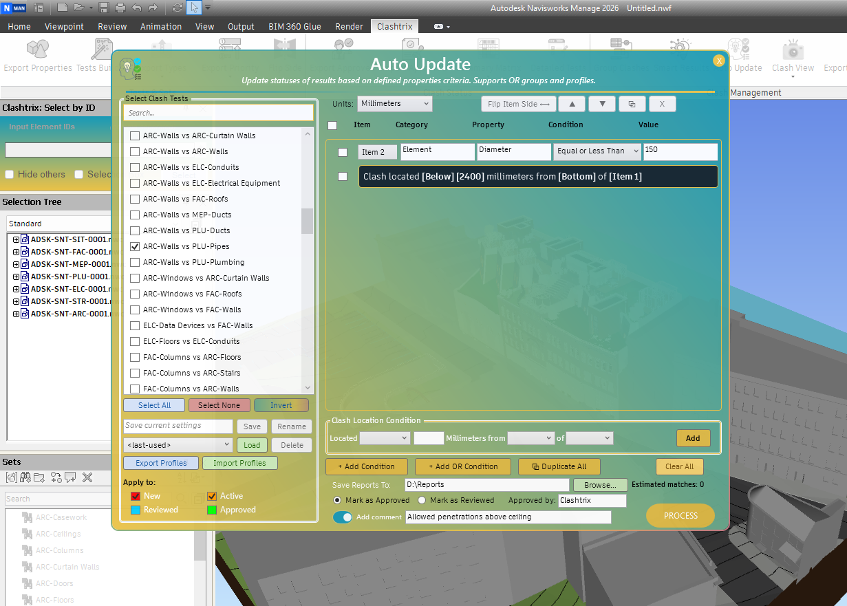 Recommended Workflow: After sharing the NWD model containing the clashes with the team, have them mark clashes as "approved" if no action is required on the model, or as "reviewed" if action is needed from another discipline. Each team should return their NWD file with updated clash statuses. Use this tool to export all approved and reviewed clashes from the NWD models.