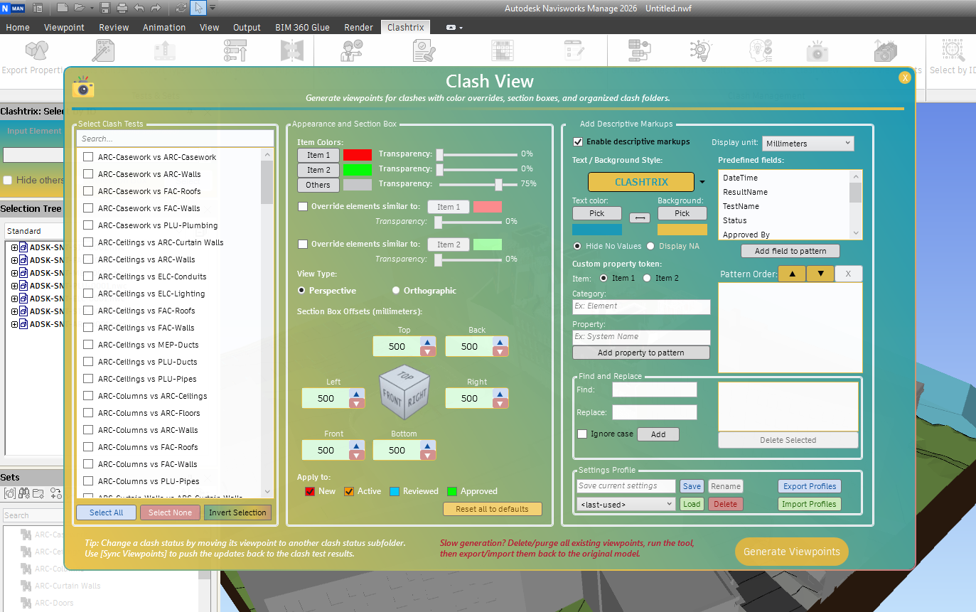 - Clash View: Quickly generates viewpoints for every clash result within your selected tests.