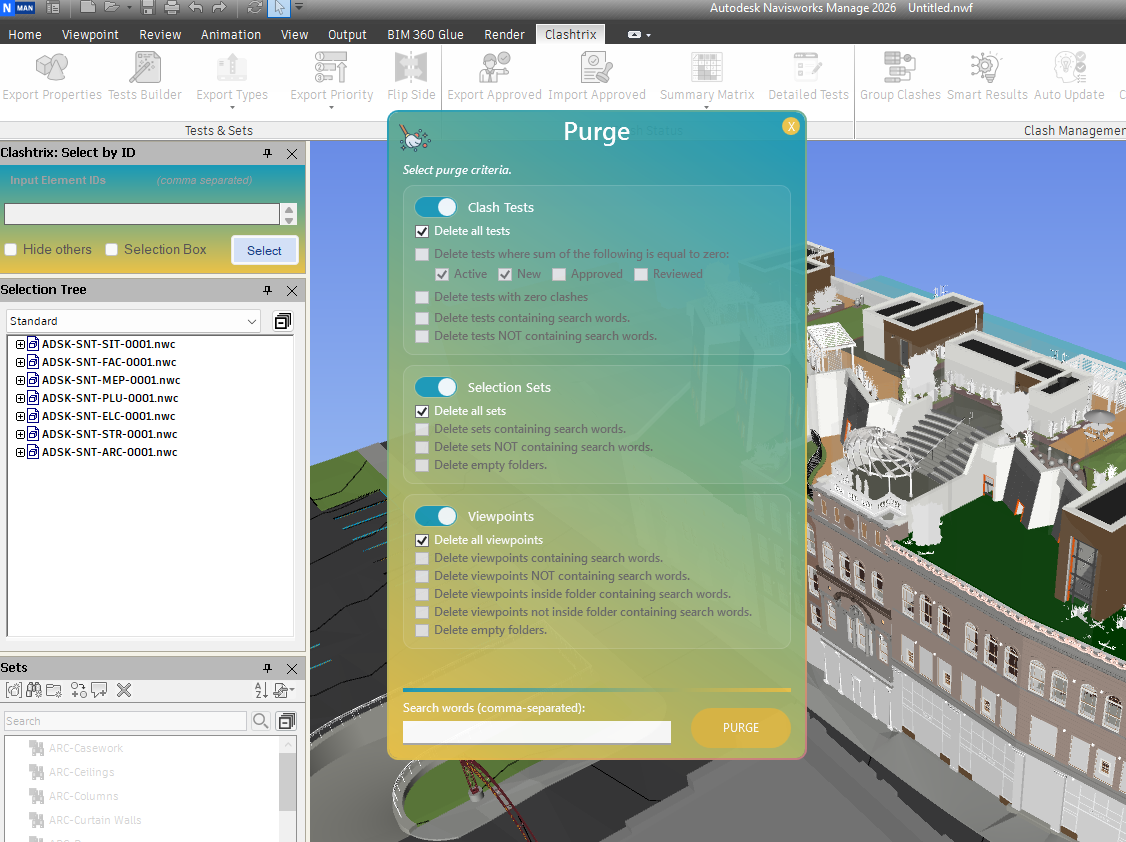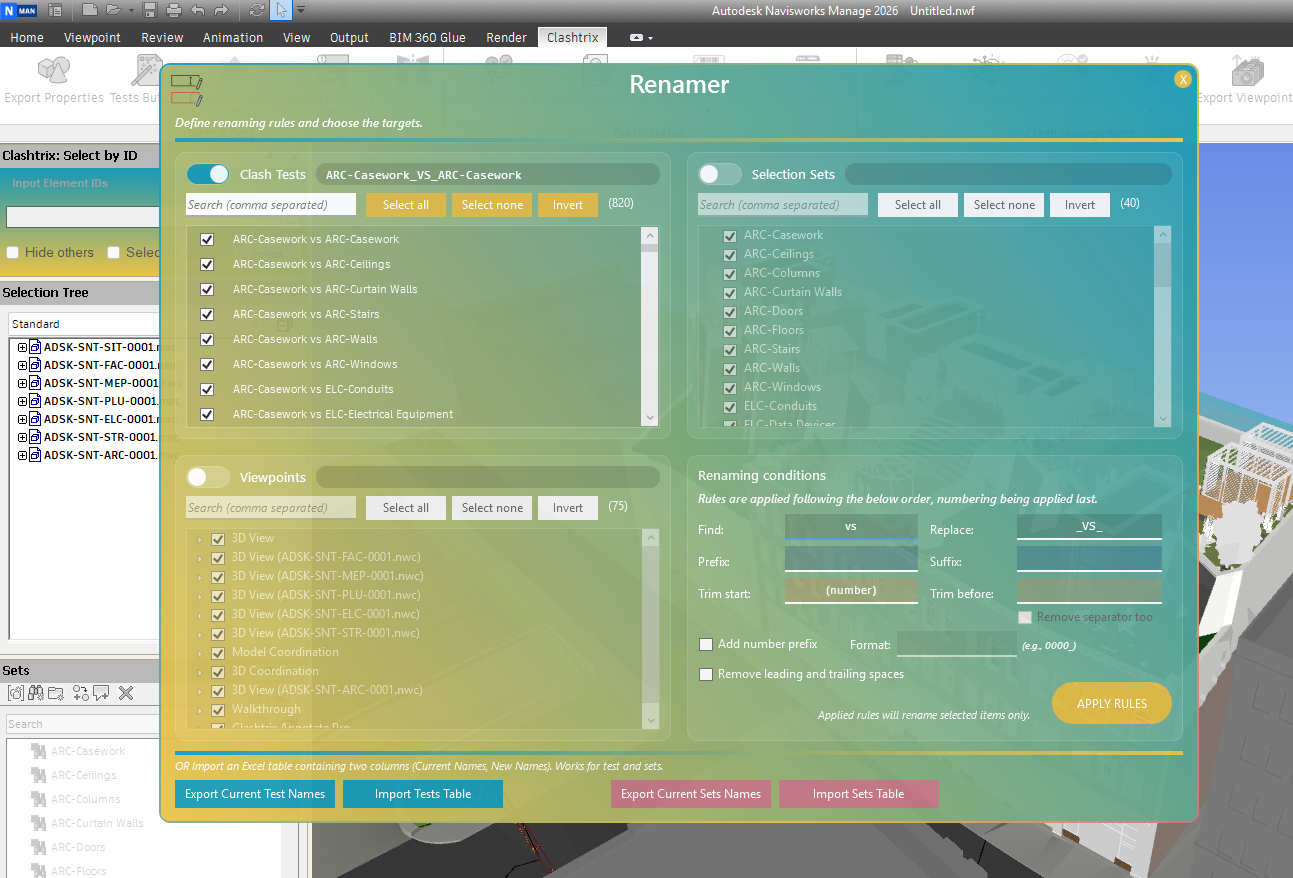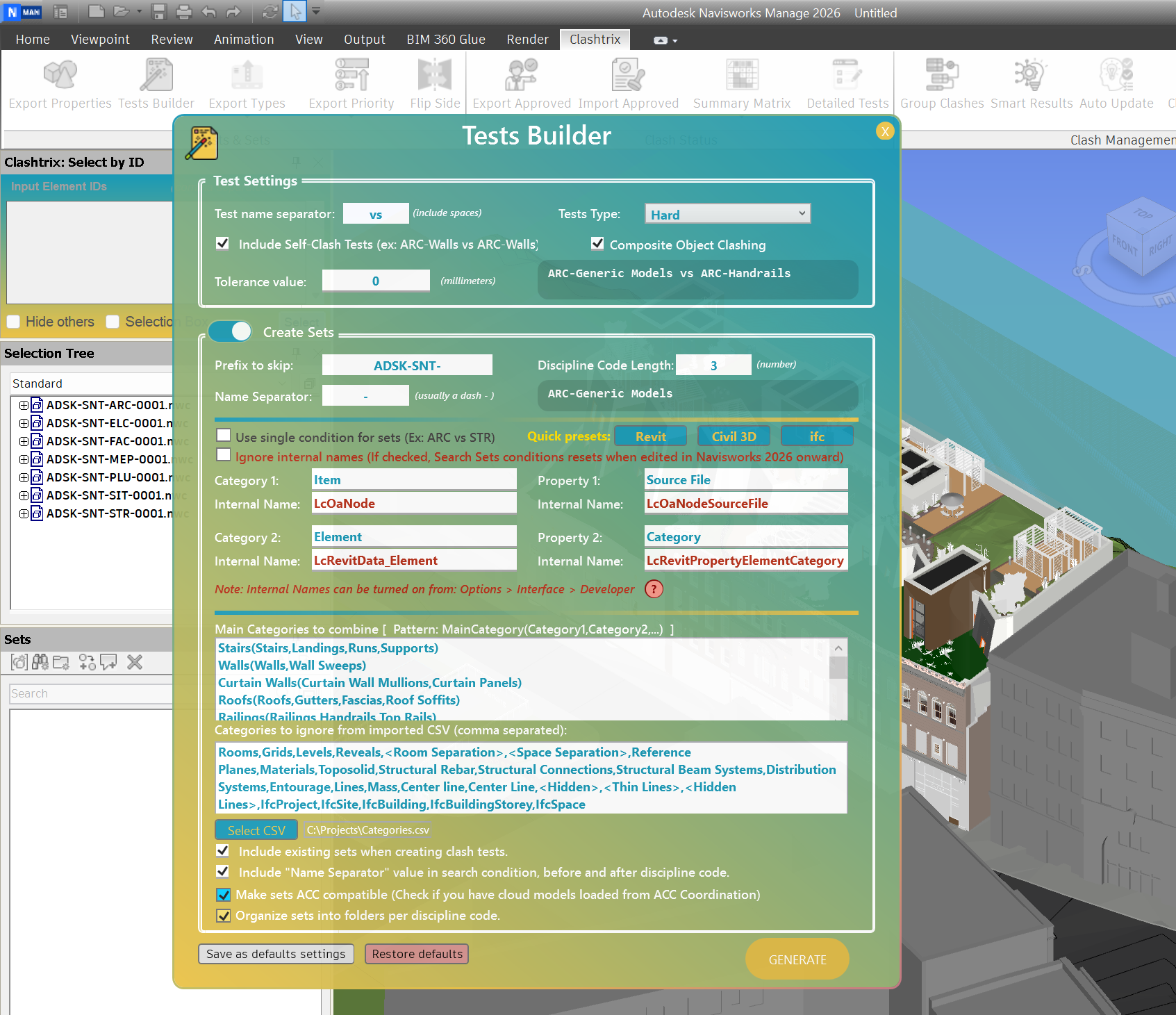 - Use the exported CSV with the Tests Builder tool to generate tailored clash tests and sets based on the existing categories.