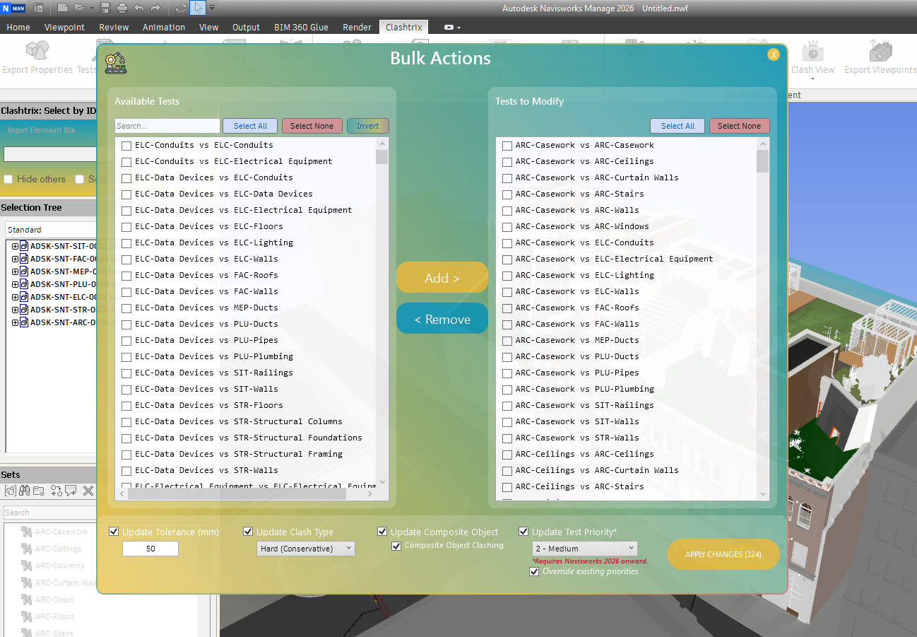 - Bulk Actions: Applies batch modifications to clash tests efficiently.