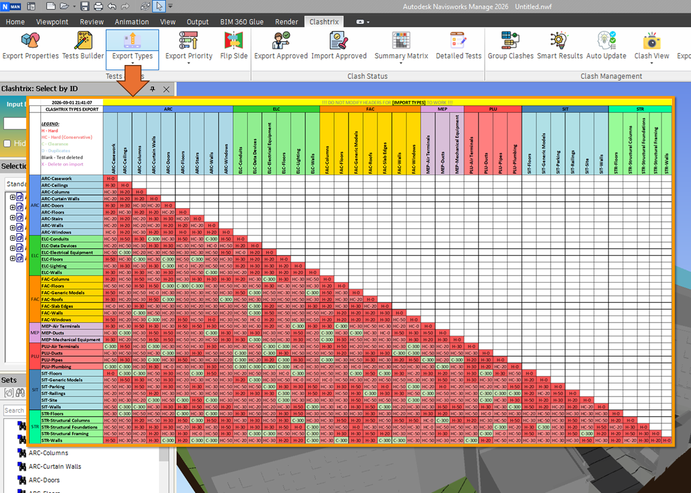 - Export clash type and priority matrices to Excel.