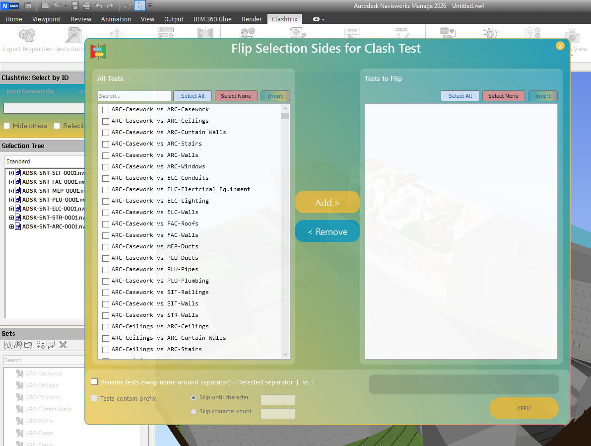 - Instantly flip Selection A and Selection B for selected clash tests.