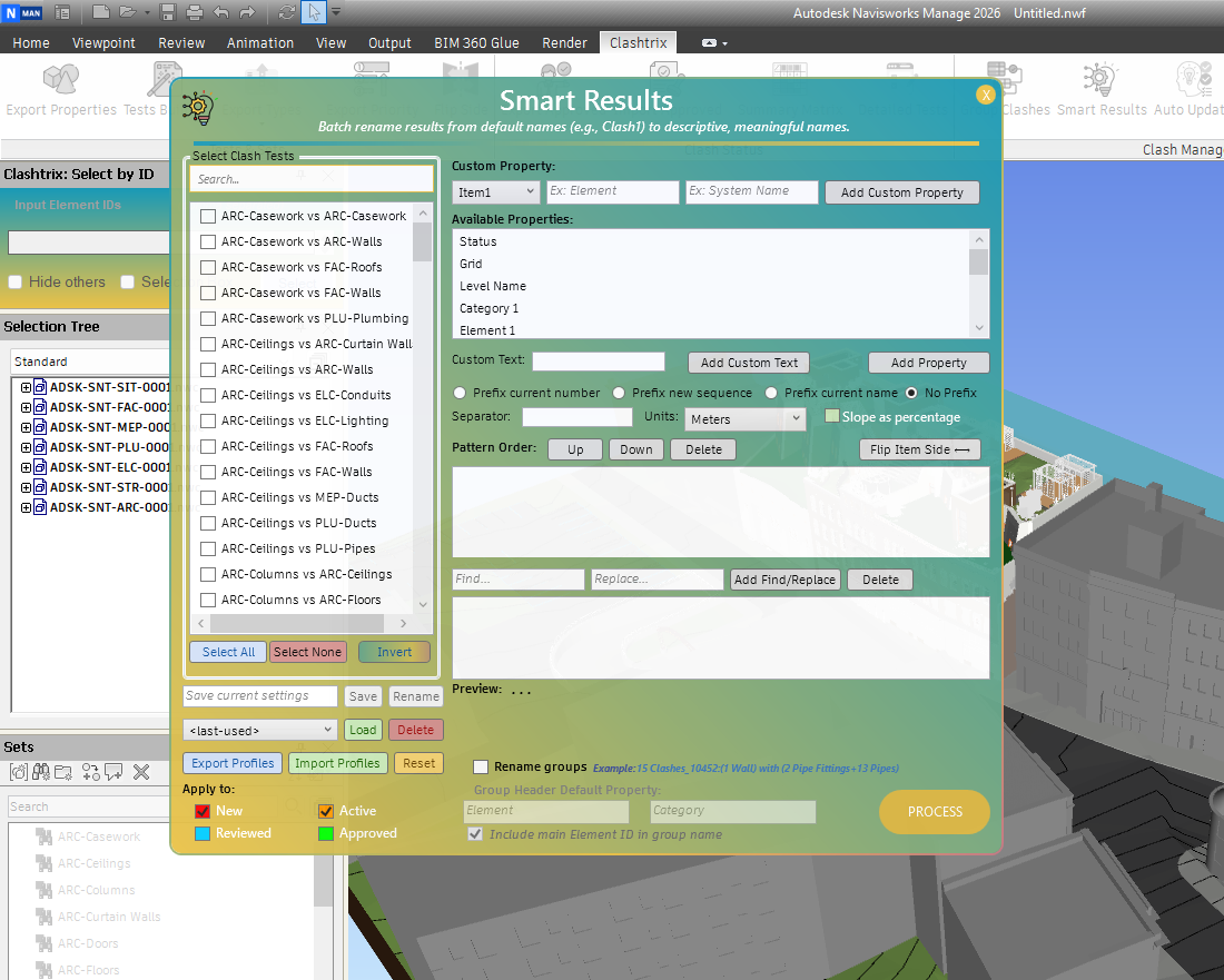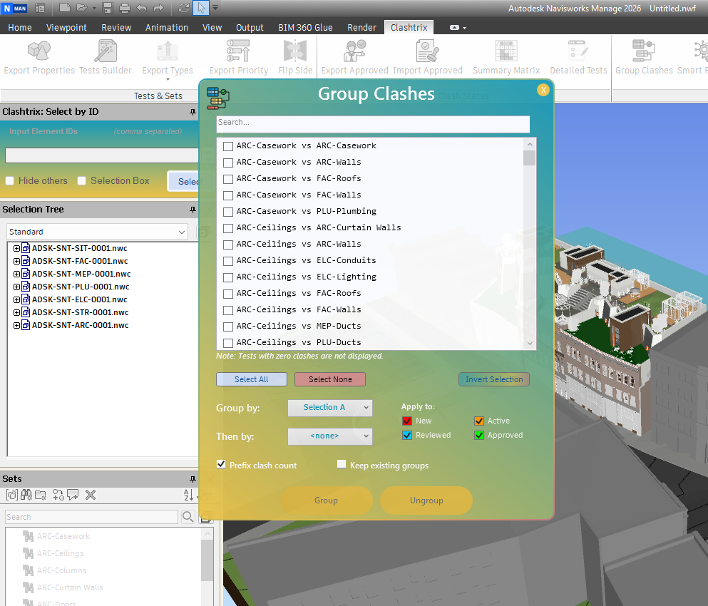 - Group Clashes: Organizes clash results into groups based on custom rules.